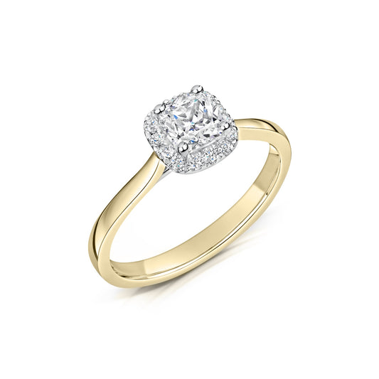 Cushion Cut Diamond Halo Engagement Ring in Yellow Gold