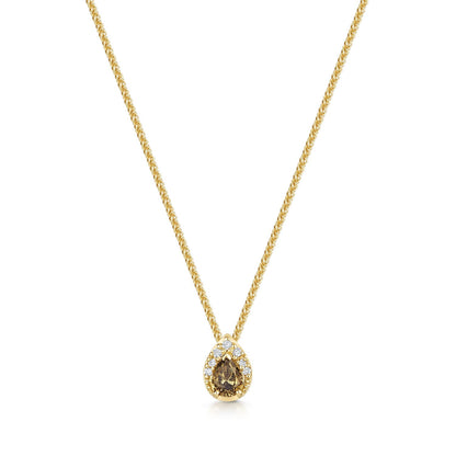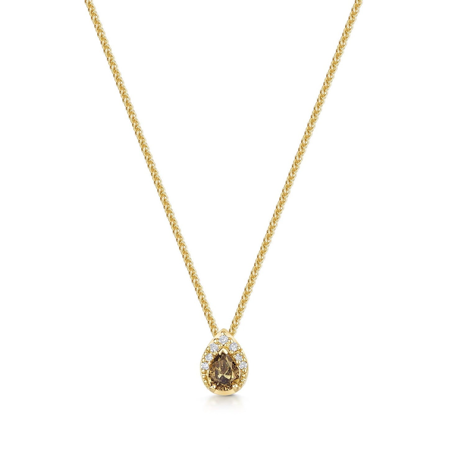 This beautiful pendant has a natural pear shaped brown diamond which is accented by natural round brilliant cut diamonds. It slides freely along the 18ct yellow gold chain for a tactile piece of jewellery.