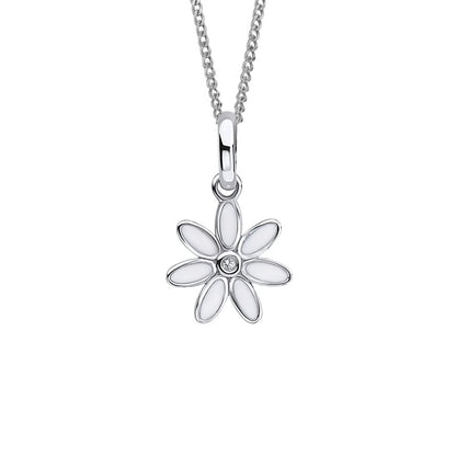 Crafted from sterling silver and platinum plating, this non-tarnishing, hypoallergenic necklace features white enamel petals and a twinkling diamond for an enchanting, eye-catching look. An adjustable length chain lets it grow with them.