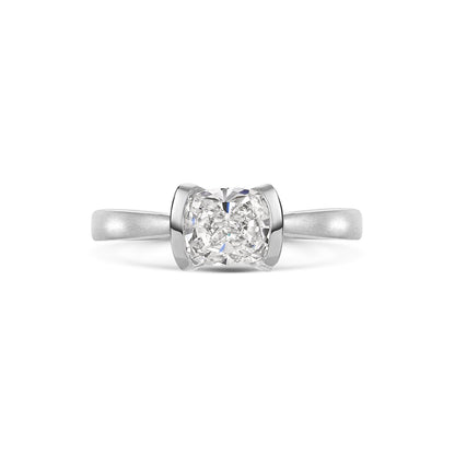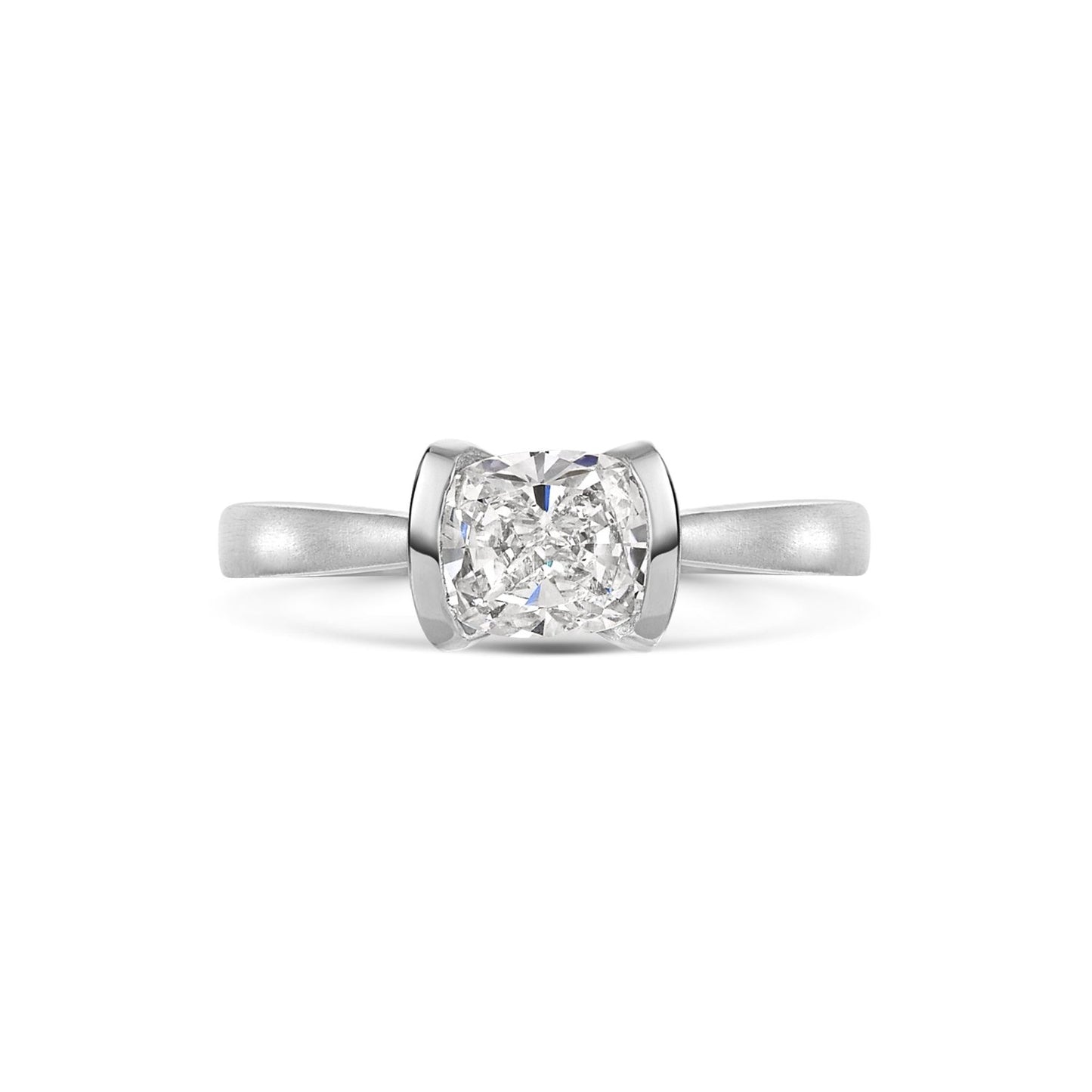 This cushion cut diamond ring is set across the finger with modern setting style, perfect for those looking for a minimal engagement ring that still makes a statement.
