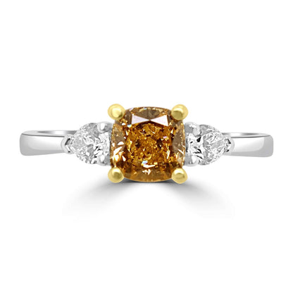 The 0.62ct Cushion Shaped Fancy Brownish Yellow Diamond is framed to perfection by its yellow gold setting, perfectly highlighting its unique hue. Add to that glistening Pear shaped diamonds of 0.25ct on the shoulders and you've got a showstopper that won't be forgotten. All backed up by GIA certification, you can be sure that this is one ring that's more than just 'fancy'! Fancy coloured diamonds are a perfect way to make a classic ring style into a unique engagement ring.