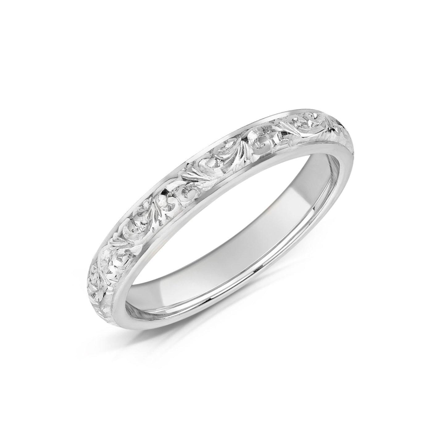 This beautiful ladies vintage style wedding ring has a scroll style pattern which has been hand engraved around the band. If you’re looking for an antique style White Gold wedding ring with a feminine touch this could be the perfect option!