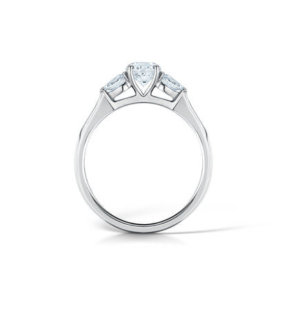 A classic diamond trilogy ring with a round brilliant cut central diamond and elegant teardrop shaped sides. The pear shaped diamonds add the delicate shape to complement the central diamond and taped down the finger.