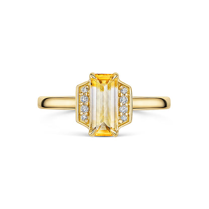 This Yellow & White Parti Sapphire Ring is crafted with natural white diamonds on either side, and set in 18ct yellow gold. The one of a kind sapphire ring from The Signature Collection features a rectangular step cut Parti Sapphire from Madagascar which has yellow and white tones.
